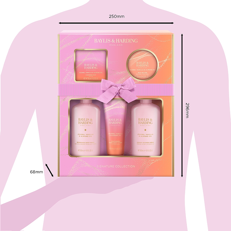 Luxusní kolekce Jojoba, Vanilla & Almond Oil je prezentována metalickými, ombré odstíny pastelově růžové a broskvové barvy s explozí třpytivých detailů, které společně s holografickým balícím papírem propůjčují kolekci ojedinělý vzhled inspirující se krásou poznání astrologie. Kolekci provází jemná a smyslná vůně vanilky, mandlového oleje a sladké jojoby.