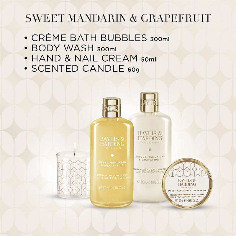 Ikonická kolekce Sweet Mandarin & Grapefruit propojuje luxusní péči s nadčasovým Art Deco stylem. Elegantní kombinace bílé, zlaté a geometrických vzorů podtrhuje slavnostní atmosféru této kolekce. Nezaměnitelná vůně se svěžími tóny citrusů a jasmínu potěší smysly a promění každodenní péči v malý rituál.