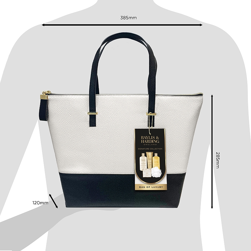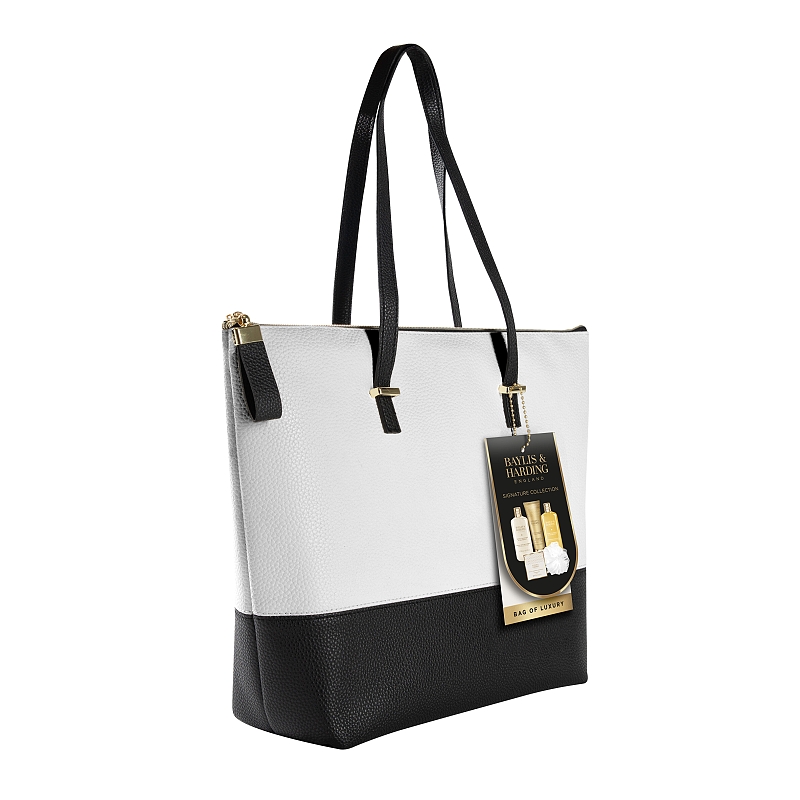 Velká kosmetická dárková sada v praktické kabelce t černo-bílé barvě se zlatým zipem a 5ti kosmetickými produkty s vůní sladké mandarinky a grapefruitu.