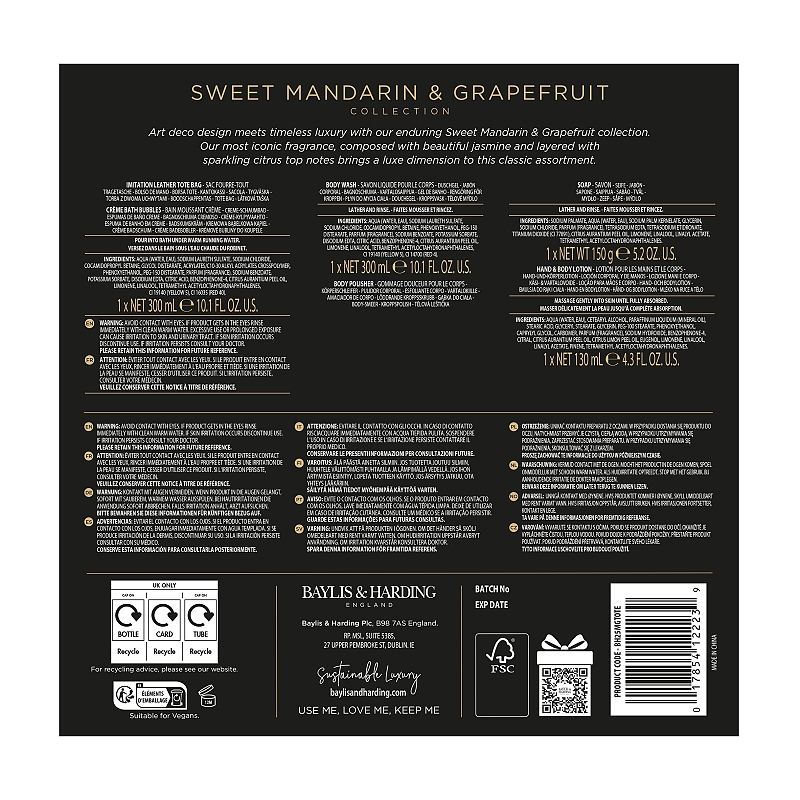 Ikonická kolekce Sweet Mandarin & Grapefruit propojuje luxusní péči s nadčasovým Art Deco stylem. Elegantní kombinace bílé, zlaté a geometrických vzorů podtrhuje slavnostní atmosféru této kolekce. Nezaměnitelná vůně se svěžími tóny citrusů a jasmínu potěší smysly a promění každodenní péči v malý rituál.