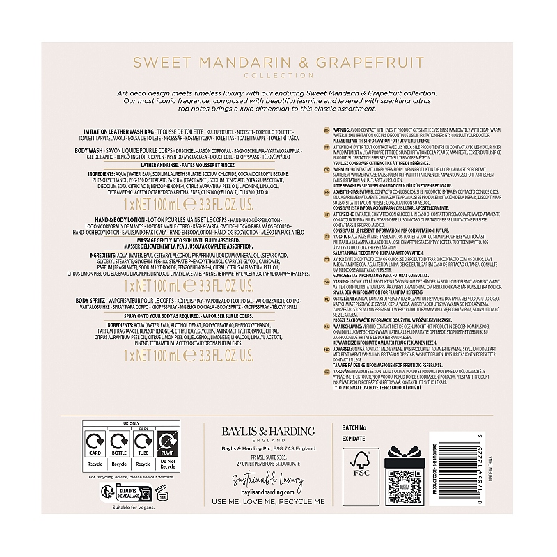 Rozmazlujte pokožku celého těla luxusními produkty s vůní sladké mandarinky, grapefruitu a jasmínu! Perfektní trio produktů osvěží tělo, navodí tu správnou atmosféru a Vy si můžete užívat chvíle relaxace a odpočinku během každodenního mycího rituálu. Sprchové mýdlo jemně čistí pokožku těla i rukou, zatímco tělové mléko dodá pokožce potřebnou hydrataci a výživu s výsledkem hladké a nádherně provoněné pokožky. Pro osvěžení během dne použijte tělový sprej, který skvěle doplní sadu péče o tělo v elegantní kosmetické taštičce!