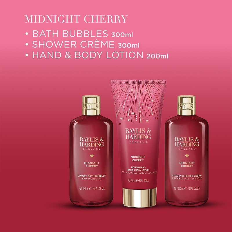 Kolekce Midnight Cherry s vůní sladkokyselé třešně, jemných mandlí a kapky likéru v sobě spojuje sváteční atmosféru a hřejivé kouzlo zimních večerů. Výrazný design v tónech rudé a růžové se zlatými detaily dodává každému produktu slavnostní nádech – ideální pro chvíle rozmazlování nebo jako luxusní dárek pod stromeček.