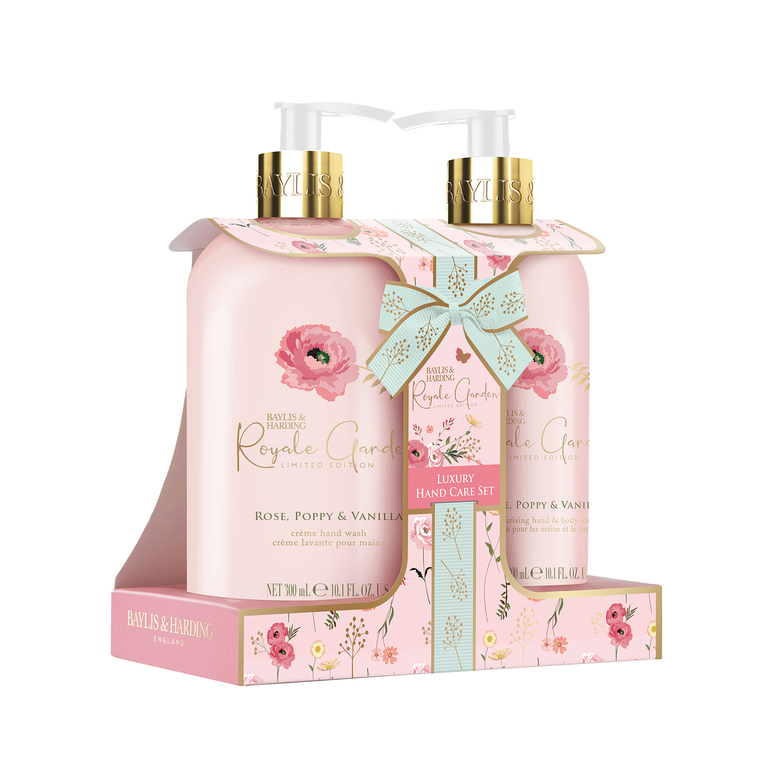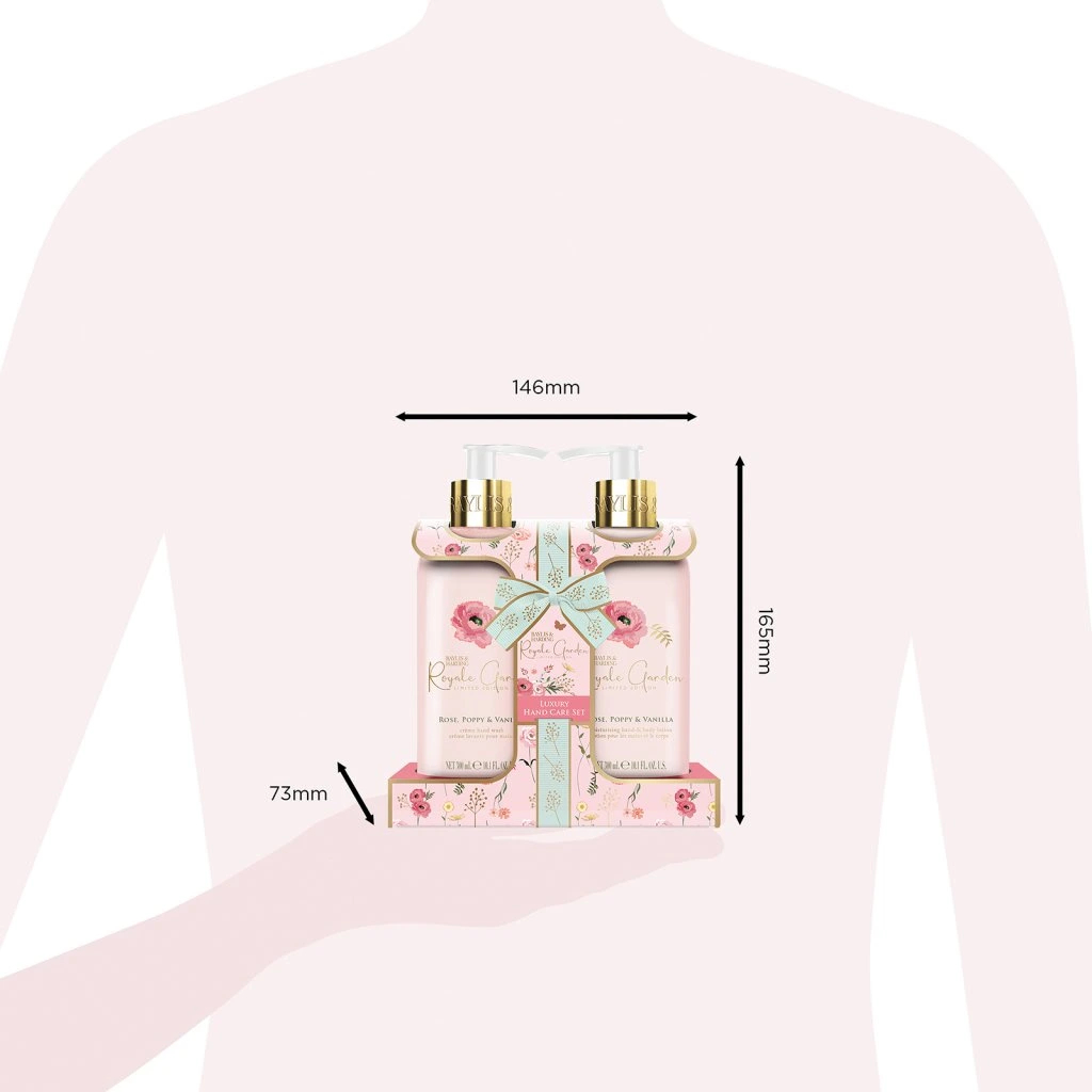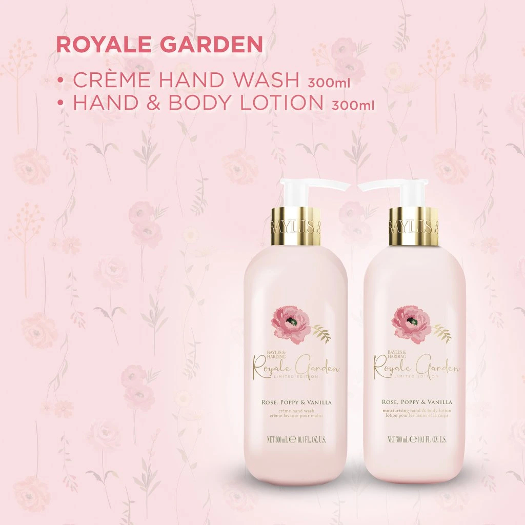 Tato stylová sada péče o ruce je zkrátka královnou každé koupelny. S praktickými pumpičkami se perfektně hodí na umyvadlo, vanu nebo do sprchového koutu. Tekuté mýdlo jemně čistí pokožku rukou, zanechává ji hebkou a nádherně provoněnou. Vyživující tělové mléko dodává pokožce potřebnou hydrataci a úlevu od pocitu suchosti. Zanechá ji hebkou, vláčnou a příjemně provoněnou něžnou vůní růže, vlčího máku a vanilky. Dopřejte si smyslný pečující rituál s Baylis & Harding!