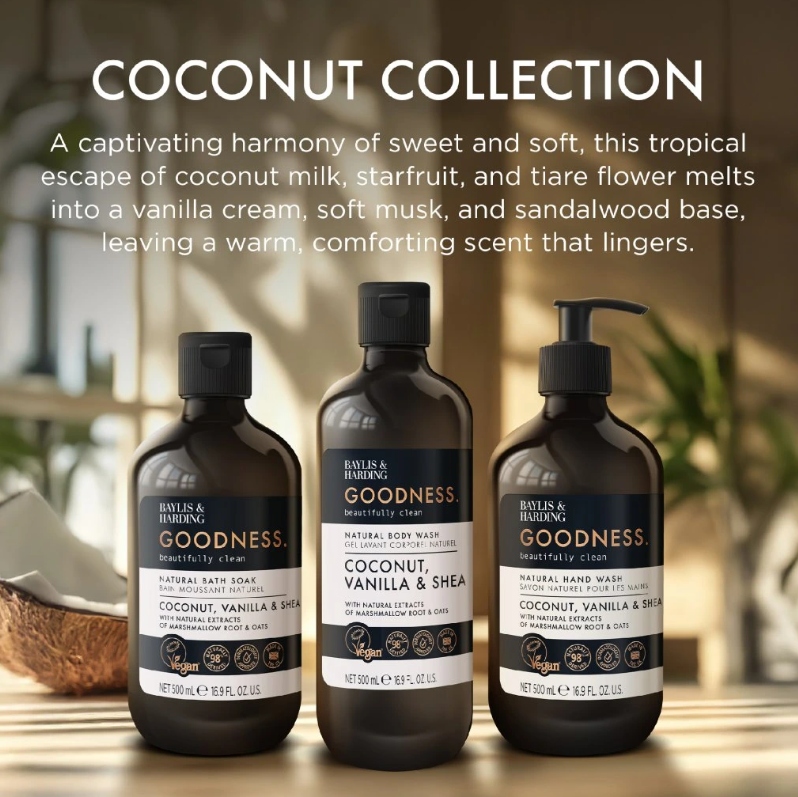 Zahalte své ruce do krémové vůně kokosového mléka, sladké vanilky a jemného shea másla. Tekuté mýdlo z kolekce Goodness přináší okamžik klidu a harmonie v každodenní rutině – s každým umytím zanechává pokožku čistou, hebkou a nádherně provoněnou. Lehká pěna s rostlinnými čisticími složkami a přírodními výtažky z kořene proskurníku a ovsa pomáhá zklidnit, zvlhčit a vyživit pokožku, zatímco tóny tropického kokosu a vanilky přináší pocit jemnosti doprovázenou nádhernou vůní.