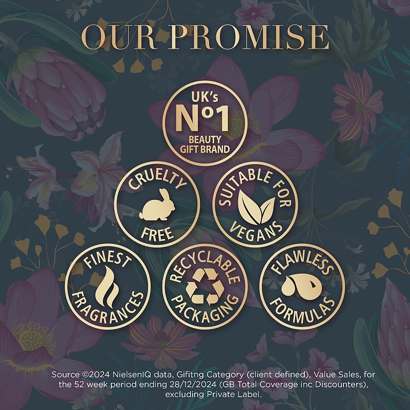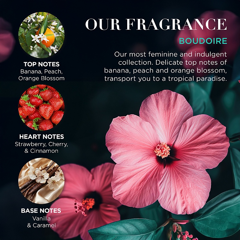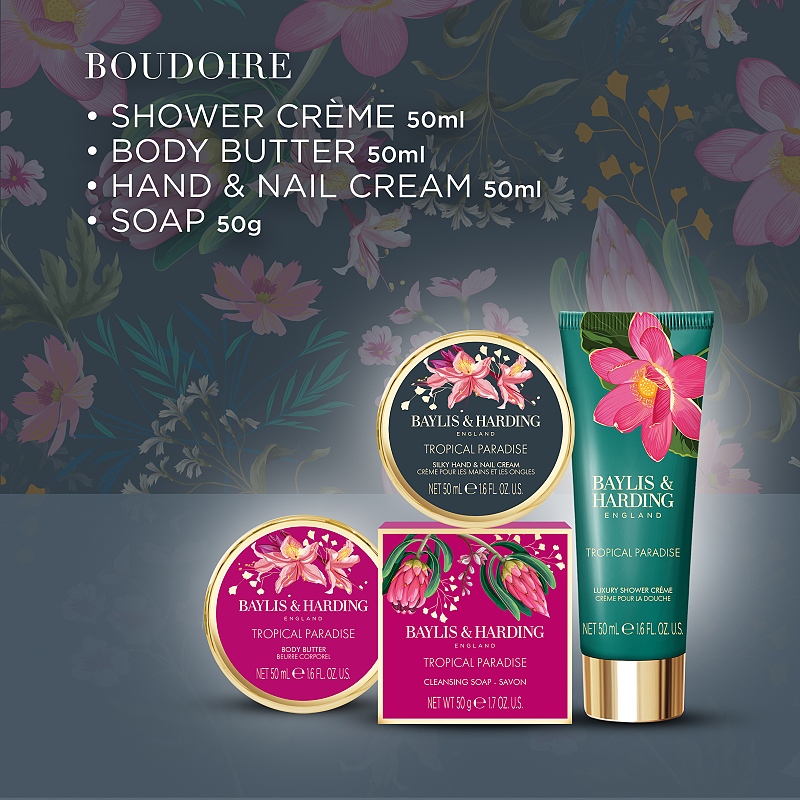 Trendy kolekce Boudoire - Tropical Paradise přináší exotický květinový design s moderním nádechem a špetkou luxusu. Odvážná paleta fuchsiové růžové a smaragdově zelené je doplněna zlatými detaily, které celé řadě dodávají výjimečný charakter. Pečující produkty a nádherné dárkové sady doprovází tropická vůně banánu, broskve a pomerančového květu.