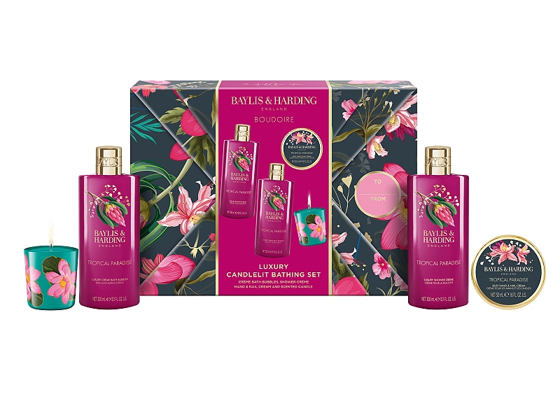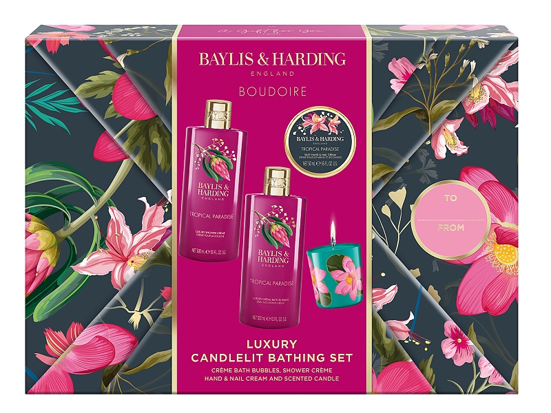 Trendy kolekce Boudoire - Tropical Paradise přináší exotický květinový design s moderním nádechem a špetkou luxusu. Odvážná paleta fuchsiové růžové a smaragdově zelené je doplněna zlatými detaily, které celé řadě dodávají výjimečný charakter. Pečující produkty a nádherné dárkové sady doprovází tropická vůně banánu, broskve a pomerančového květu.