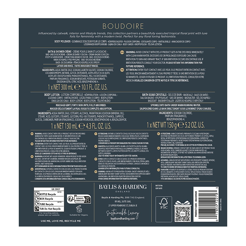 Trendy kolekce Boudoire - Tropical Paradise přináší exotický květinový design s moderním nádechem a špetkou luxusu. Odvážná paleta fuchsiové růžové a smaragdově zelené je doplněna zlatými detaily, které celé řadě dodávají výjimečný charakter. Pečující produkty a nádherné dárkové sady doprovází tropická vůně banánu, broskve a pomerančového květu.