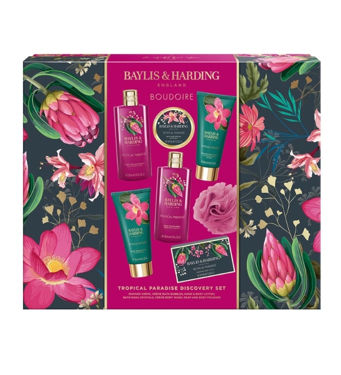 Trendy kolekce Boudoire - Tropical Paradise přináší exotický květinový design s moderním nádechem a špetkou luxusu. Odvážná paleta fuchsiové růžové a smaragdově zelené je doplněna zlatými detaily, které celé řadě dodávají výjimečný charakter. Pečující produkty a nádherné dárkové sady doprovází tropická vůně banánu, broskve a pomerančového květu.