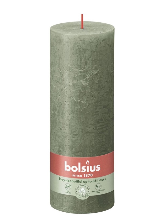 Svíčka válec o výšce 19cm v trendy barvě zelené olivové od firmy Bolsius. Bude nadčasovou dekorací vašich domovů.