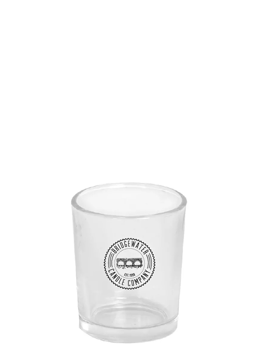 Skleněný svícen na votivní svíčku s logem americké firmy Bridgewater.