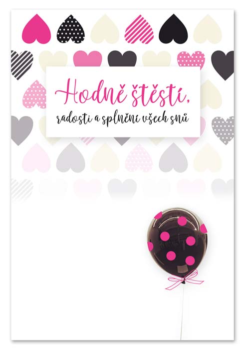 Text uvnitř prání: HODNĚ ŠTĚSTÍ, RADOSTI A SPLNĚNÍ VŠECH SNŮ.