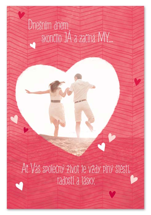 Text uvnitř přání: DNEŠNÍM DNEM SKONČILO JÁ A ZAČÍNÁ MY... AŤ VÁŠ SPOLEČNÝ ŽIVOT JE PLNÝ ŠTĚSTÍ, RADOSTI A LÁSKY.