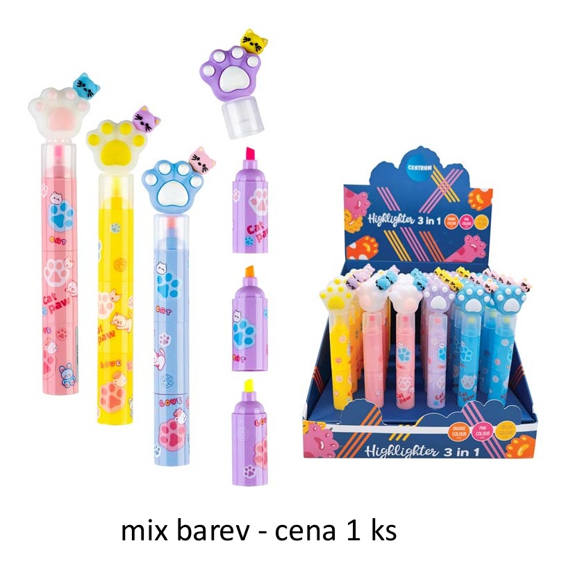 Praktický "kočičí" zvýrazňovač 3 barvy v jedné tlapce.