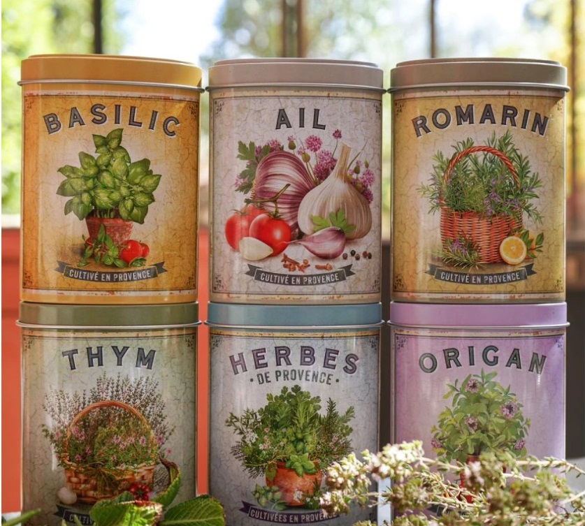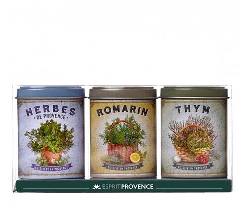 Sada bylinek v plechovkách obsahuje rozmarýn, tymián a provensálskou směs.