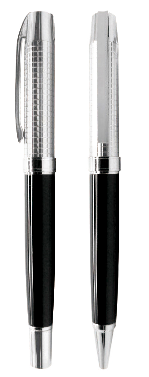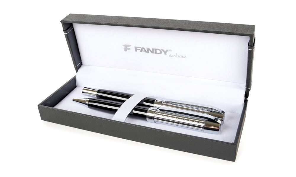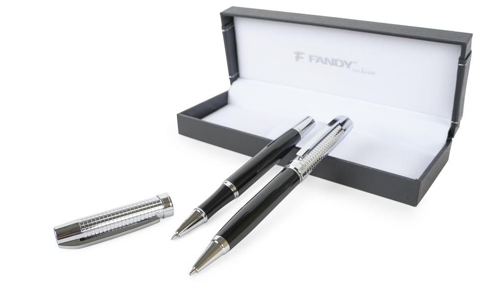 Souprava kovového kuličkového pera a rolleru v luxusní dárkové krabičce. Kuličkové pero s otočným mechanismem, roller s víčkem, vyměnitelná náplň typ F-Parker, šíře stopy 0,7 mm (kuličkové pero), Ceramic, šíře stopy 0,5 mm (roller), modrý inkoust.