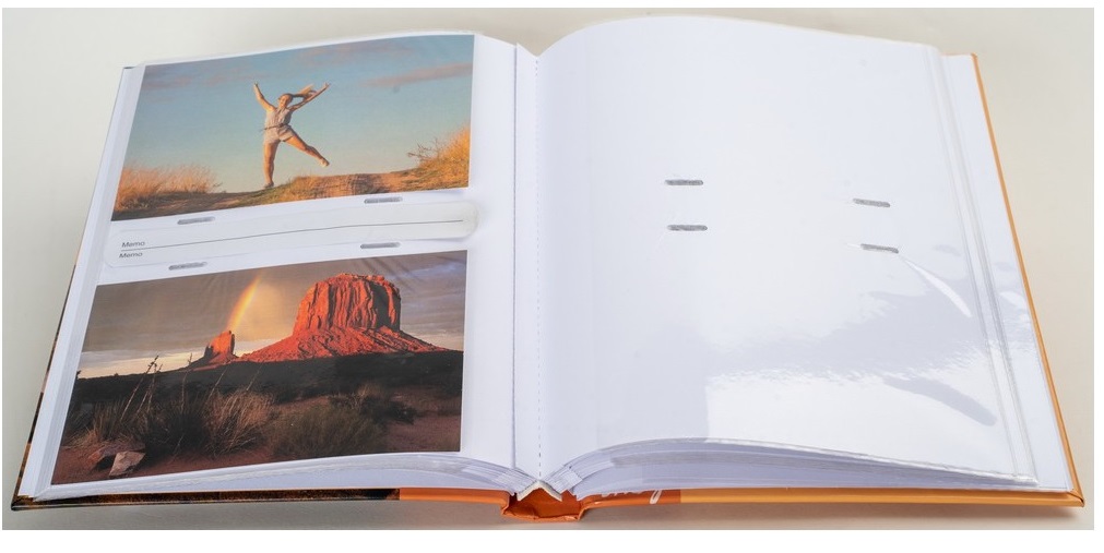 Cestovatelské album na 100 fotografií se šitou vazbou, dvě fotografie nad sebou, popiska mezi fotografiemi.