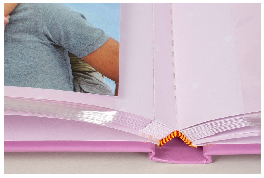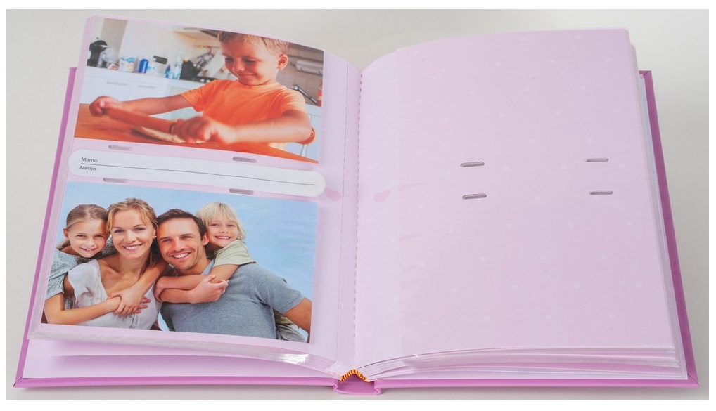 Dětská album na 100 fotografií se šitou vazbou, dvě fotografie nad sebou, popiska mezi fotografiemi.