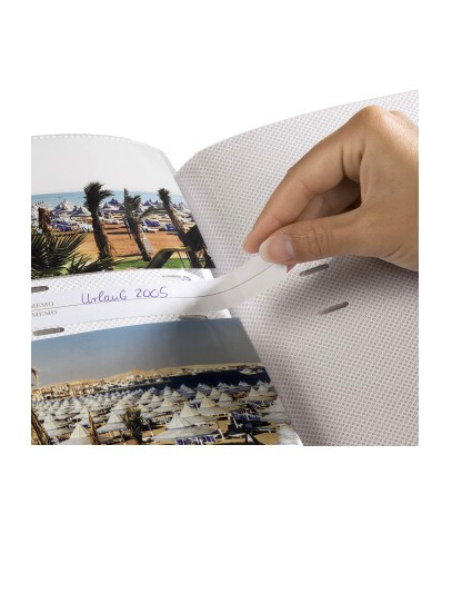 Fotoalbum na 200 fotografií 10x15, šitá kniha, dvě fotografie nad sebou, popiska mezi fotografiemi.
