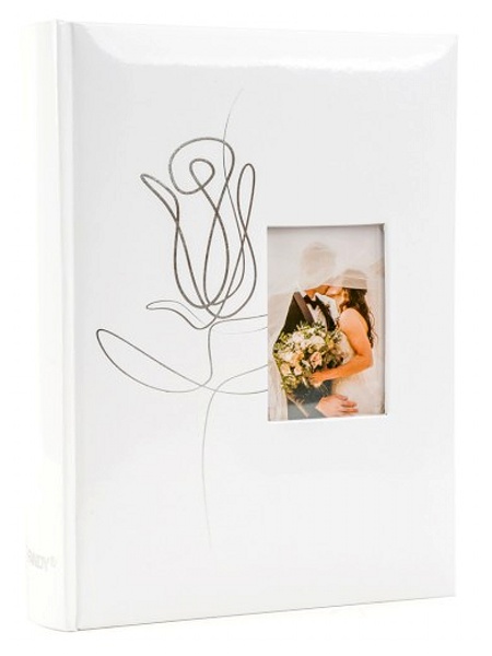 Luxusní svatební fotoalbum s růží na 200 fotografií 10x15 cm, dvě fotografie nad sebou, popiska mezi fotografiemi, možnost vložit vlastní foto nebo text na titulní stranu (6 x 8,5 cm).