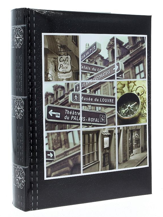 Fotoalbum na 200 fotografií 10x15, šitá kniha, dvě fotografie nad sebou, popiska mezi fotografiemi.