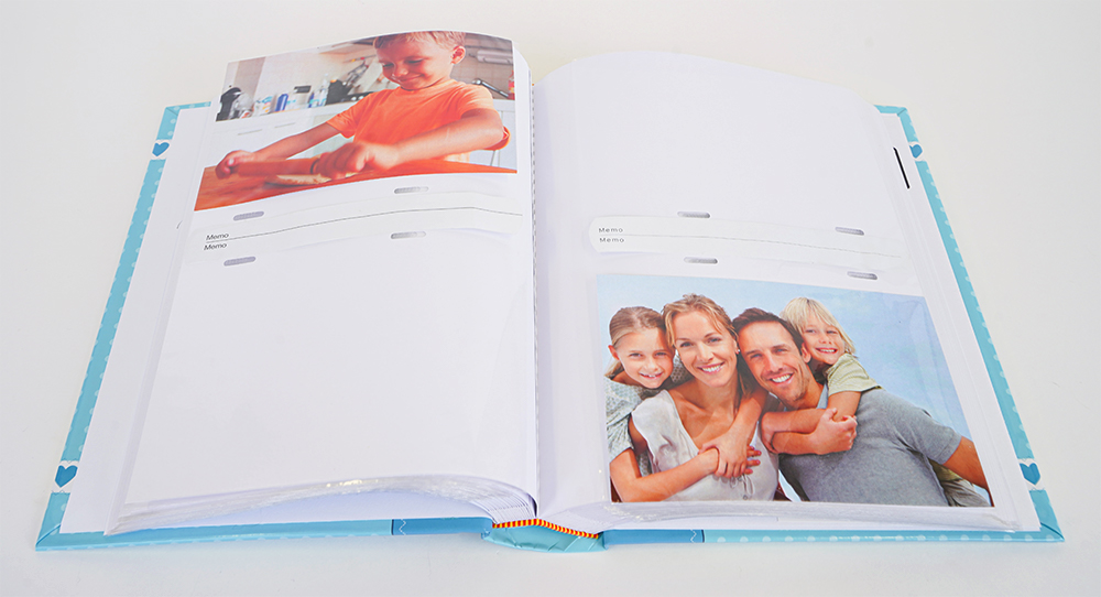 Dětské fotoalbum na 200 fotografií 10x15, zasunovací, šitá kniha, dvě fotografie nad sebou, popiska mezi fotografiemi. V zadní části alba kapsa s popiskami.