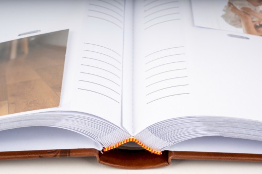 Luxusní fotoalbum s aplikací, šitá kniha, dvě fotografie nad sebou, popiska z boku u hřbetu.