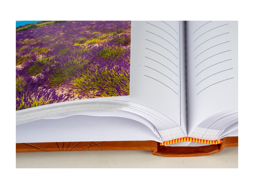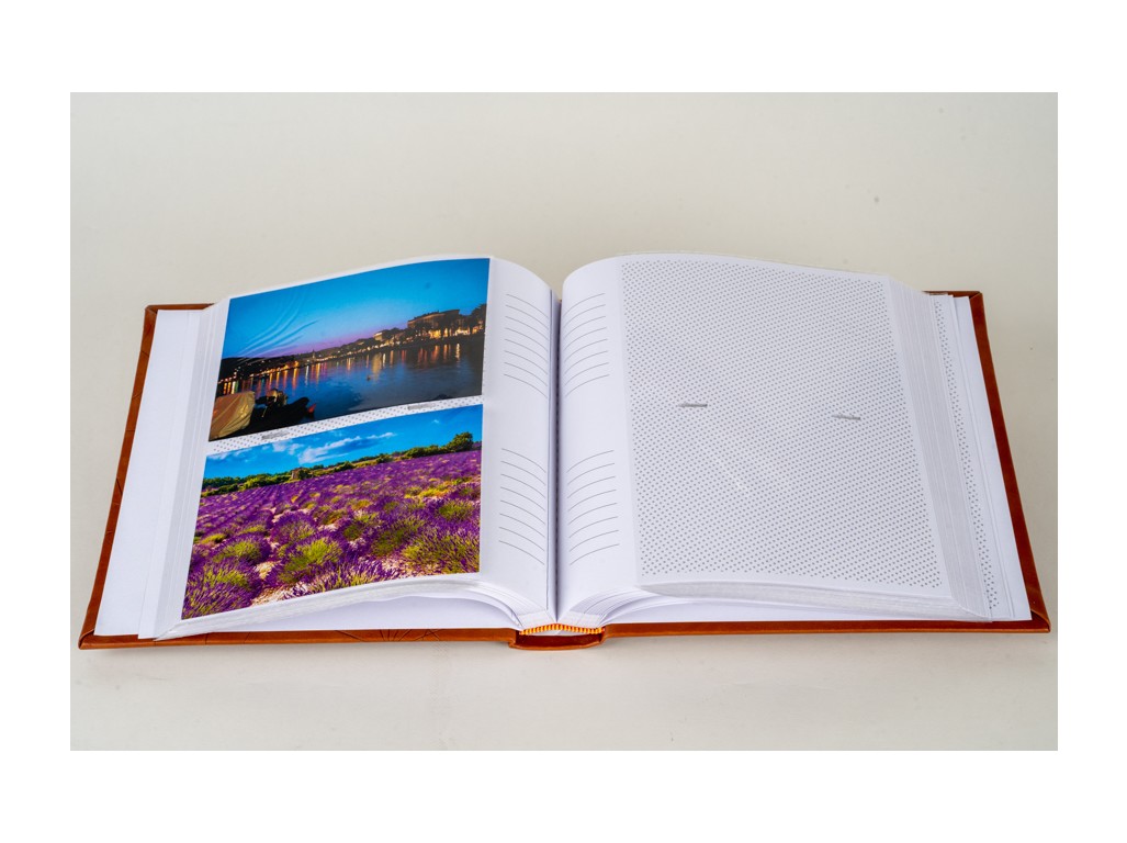 Luxusní fotoalbum na 200 fotografií 10x15 cm, šitá kniha, dvě fotografie nad sebou, popiska mezi fotografiemi.