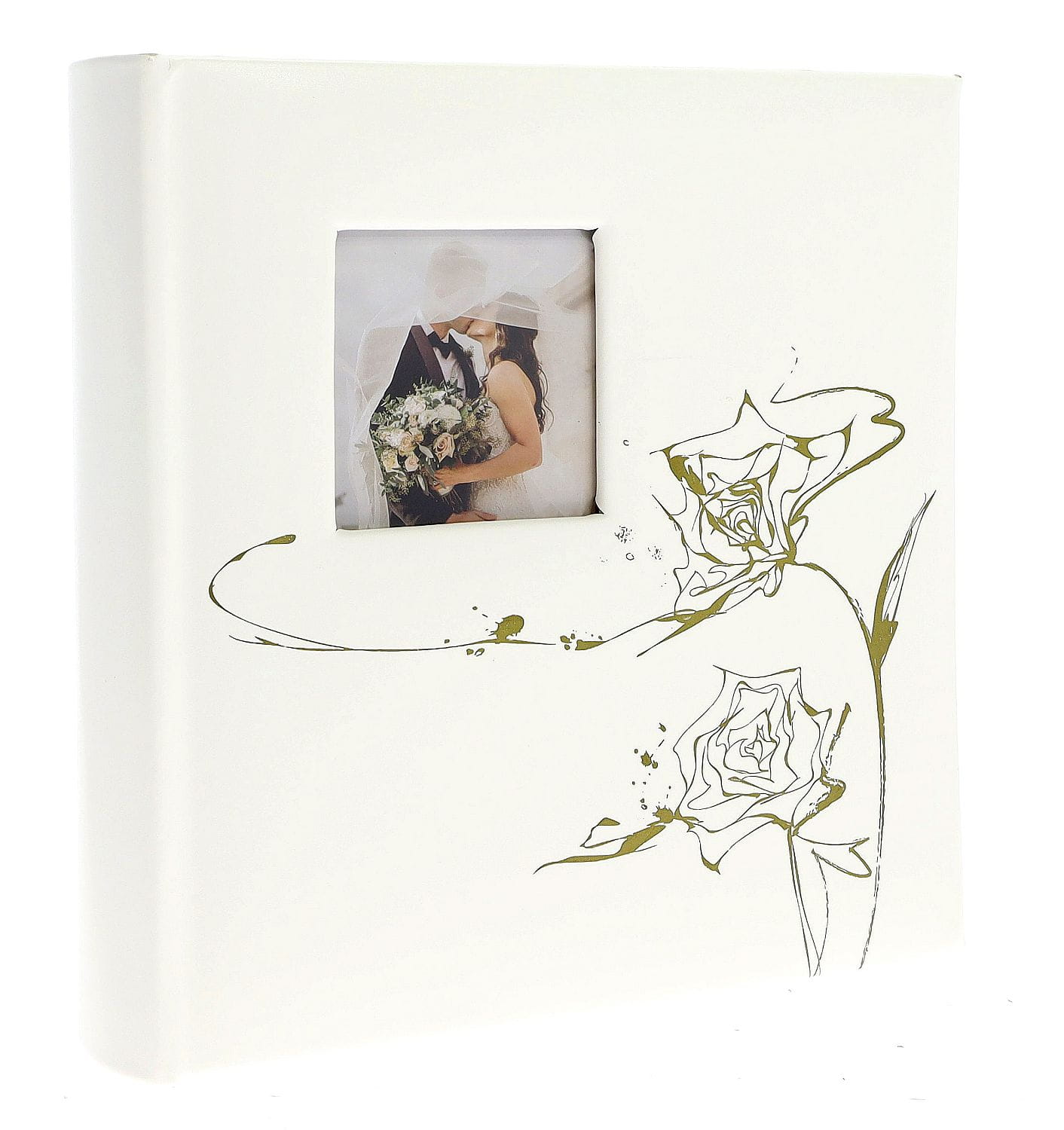 Svatební fotoalbum na 200 fotografií 10x15, šitá kniha, dvě fotografie pod sebou, popiska u hřbetu fotoalba. Materiál desek potištěná koženka s okénkem 7x7cm pro vložení vlastní fotografie nebo textu.