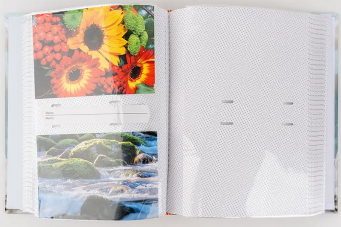 Zasunovací fotoalbum na 300 fotografií 10x15, šitá vazba, dvě fotografie nad sebou, popiska mezi fotografiemi. Kapsa s popiskovými štítky je na zadní straně desek.