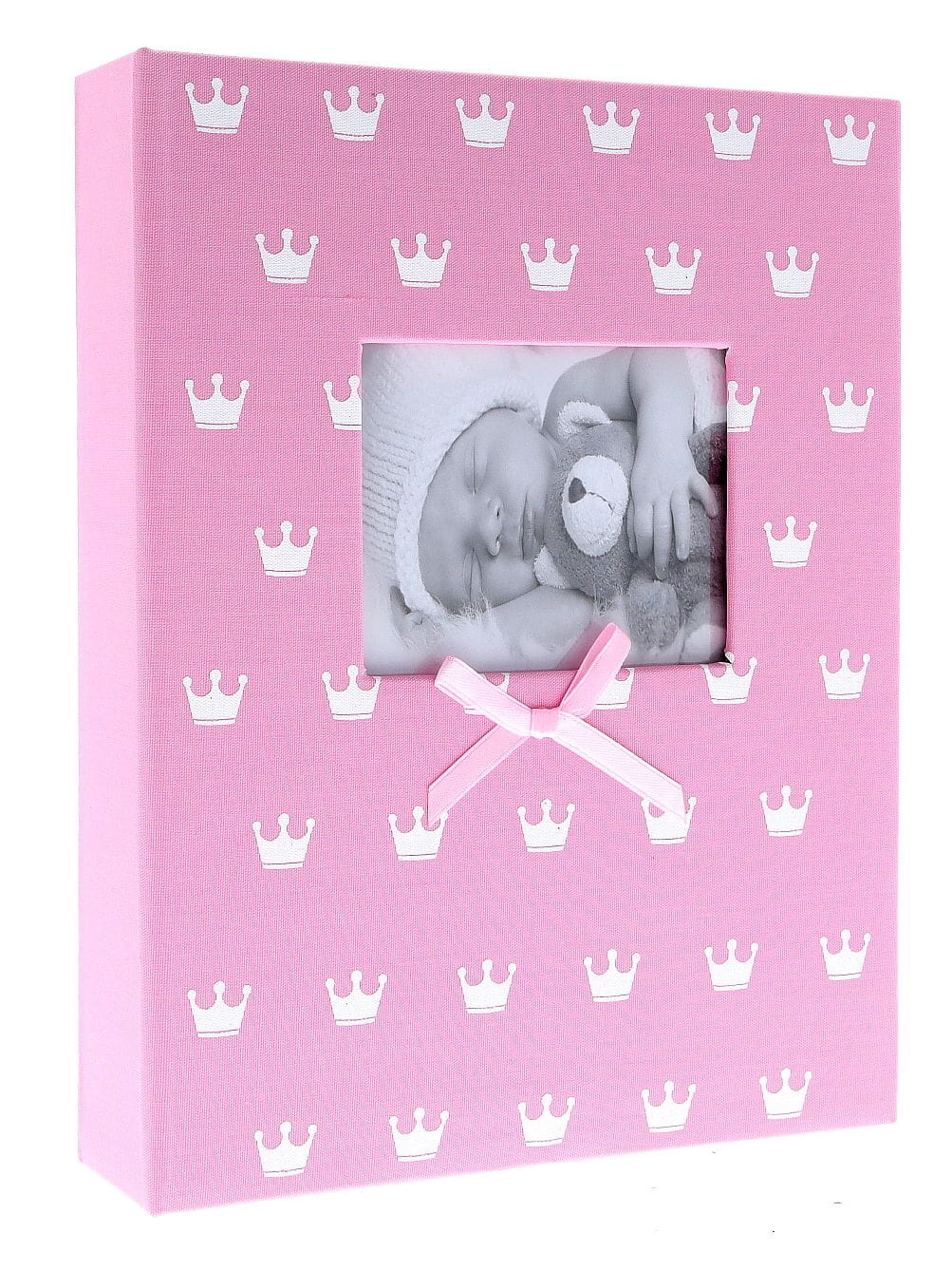 Nádherné dětské fotoalbum bez popisky s lněnými deskami, potiskem, stuhou a okénkem (7x9cm). Album má PVC bílé listy, svařovanou vazbu, nemá možnost popisky.