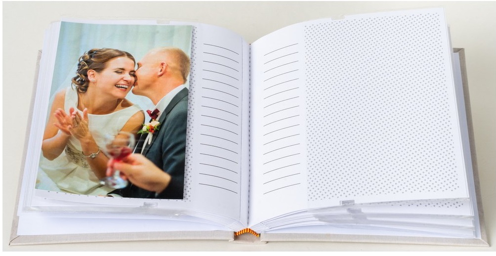 Kapesní svatební fotoalbum na 50 fotografií 10x15, šitá vazba, jedna fotografie na stránce, popiska u hřbetu. Možnost vložit vlastní foto na titulní stranu.