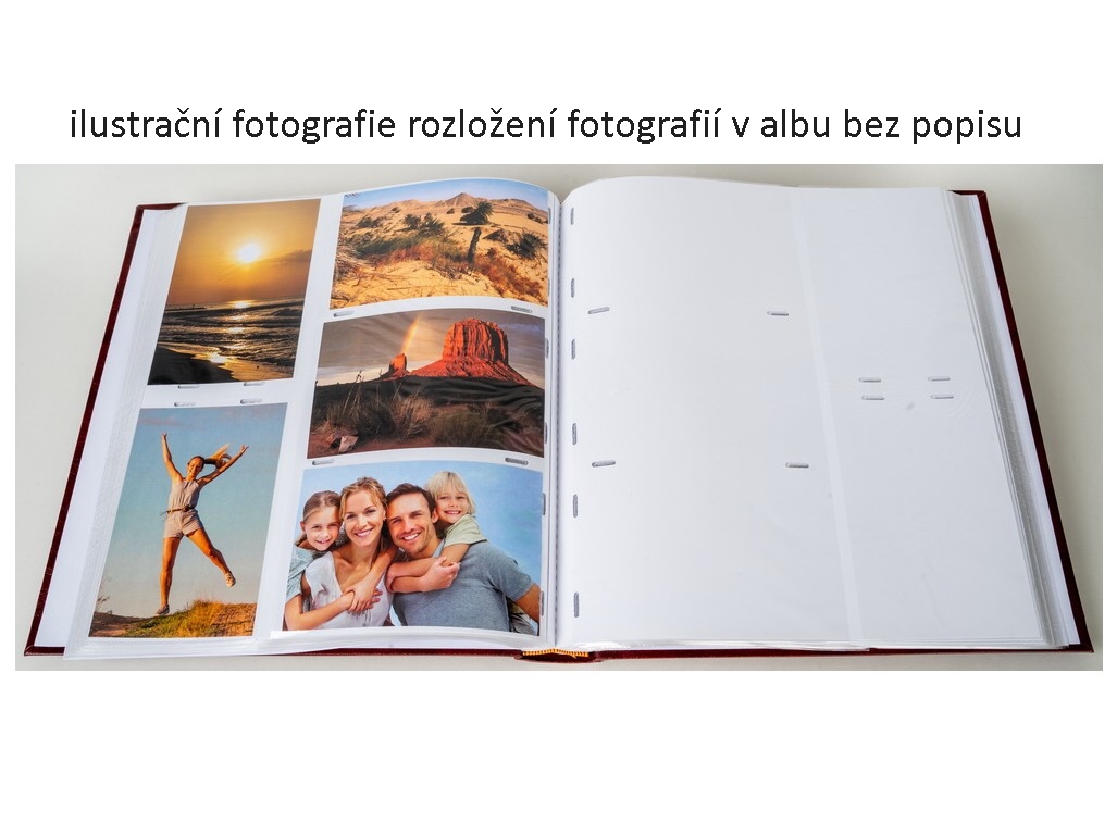 Zasunovací fotoalbum na 500 fotografií 10x15, šitá kniha, 5 fotografií na stránce, dvě na výšku, tři na šířku, bez možnosti popisky.