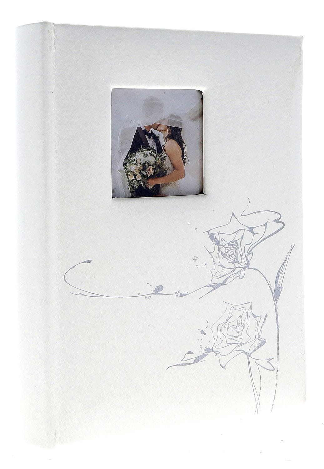 Svatební fotoalbum na 50 fotografií 13x18cm, šitá kniha, jedna fotografie na stránce, bez možnosti popisky. Materiál desek potištěná koženka s okénkem (7x7cm) s možností vložit vlastní foto nebo text na titulní stranu.