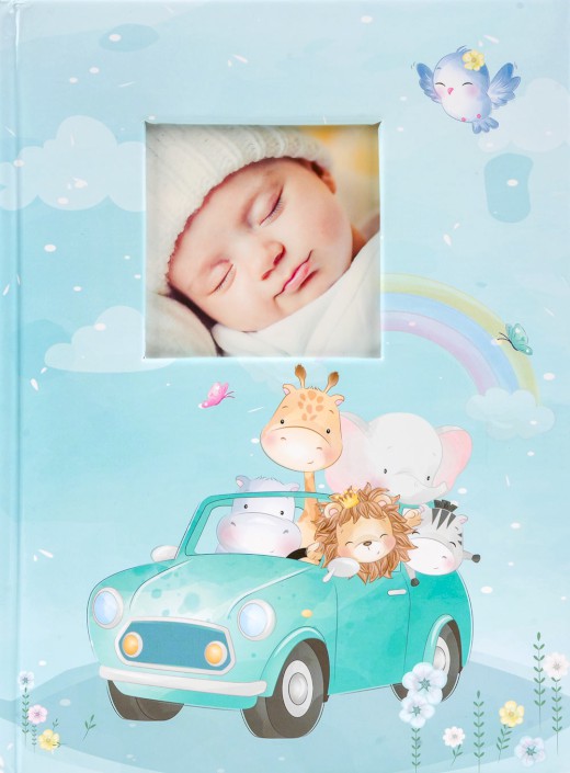 Fotoalbum na 300 fotografií 9x13, šitá kniha, tři fotografie nad sebou, popiska mezi fotografiemi. Možnost vložit vlastní foto nebo text na titulní stranu alba (7x7cm).