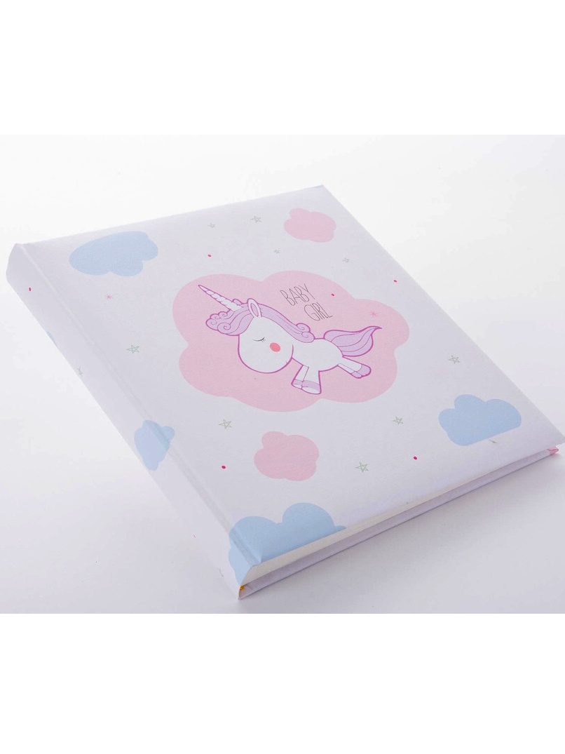Krásné dívčí fotoalbum s motivem jednorožce. 60 bílých stran, šitá vazba, pergamenový papír dělící listy, velikost 30x31cm.