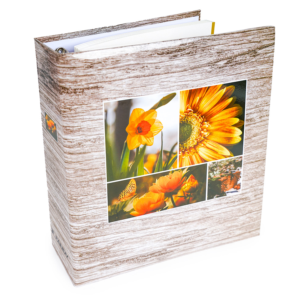 Samolepicí fotoalbum s kroužkovou vazbou (ring vazbou), 50 listů - 100 stran. Vnitřní listy mají zlaté okraje.