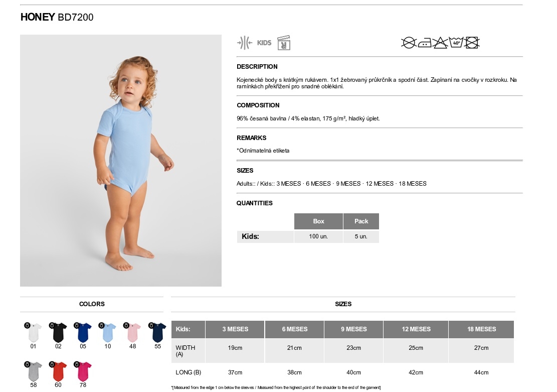 Kojenecké body s krátkým rukávem. 1x1 žebrovaný průkrčník a spodní část. Zapínaní na cvočky v rozkroku. Na ramínkách překřížení pro snadné oblékání.