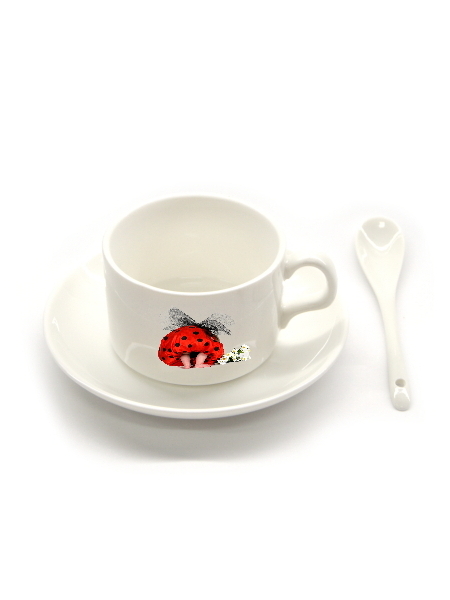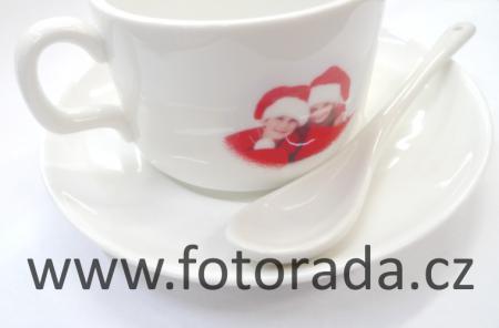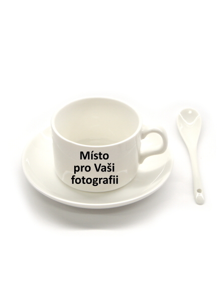 Elegantní kávový set potěší každého milovníka kávy - obzvlášť pokud ho dostane upravený přímo na míru. Tento set obsahuje tři díly (hrneček 150ml, lžičku a podšálek). Hrnek je skutečně drobný (potisk lze tedy realizovat pouze menší (40 mm) než na klasický hrnek (88mm).) Průměr 80 mm / výška 55 mm - umožňuje oboustranný tisk a bude mu slušet jakékoliv logo/obrázek mu vyberete. Lžička ani talířek nejsou potiskovatelné.