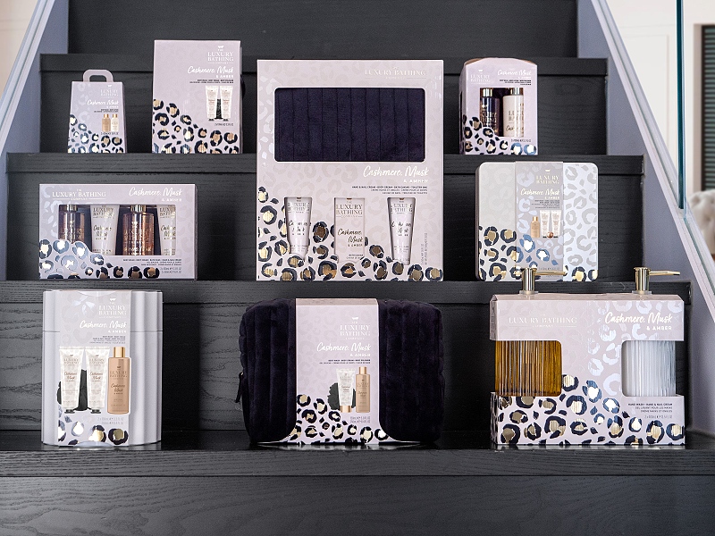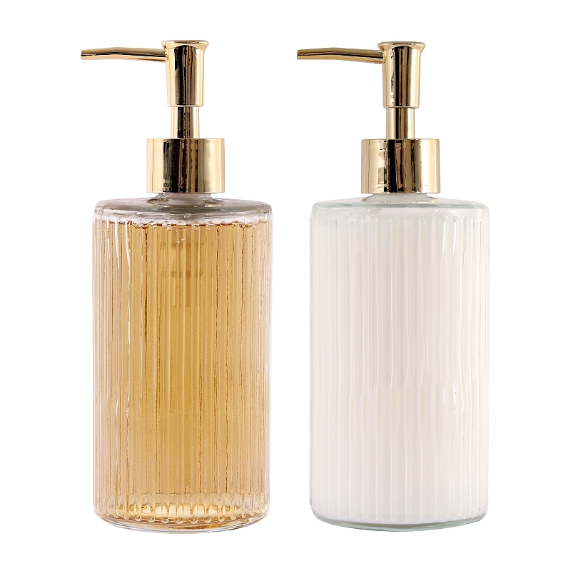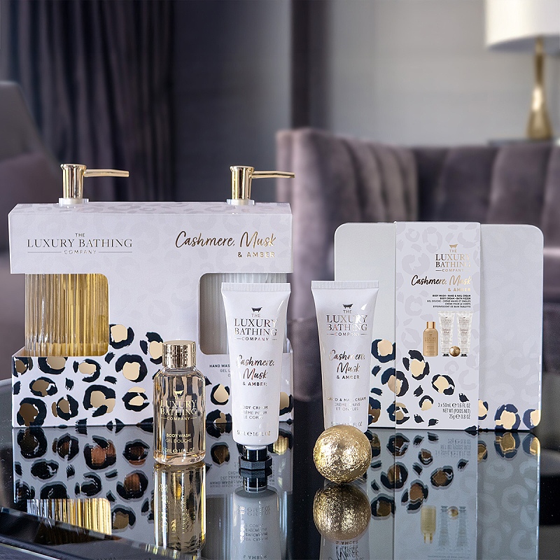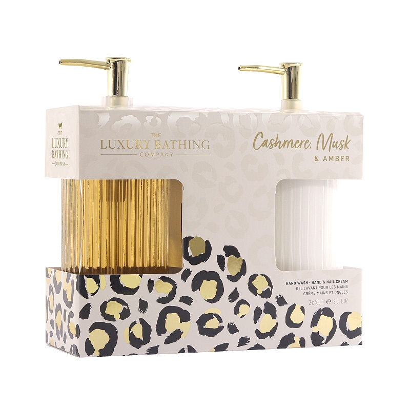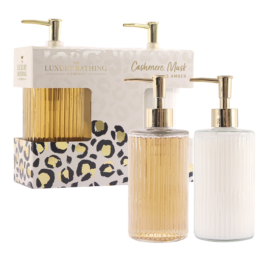 Nádherná skleněná sada s tekutým mýdlem a krémem na ruce a tělo s vůní kašmíru, mošusu a ambry.