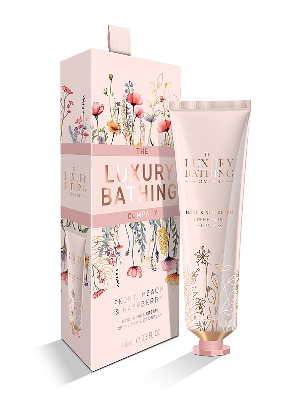 Hydratační krém na ruce s vůní pivoněk, malin a broskví, v dárkové krabičce.