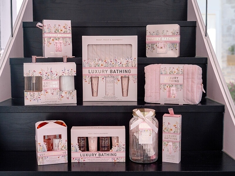 Radostná kolekce Floral Finesse, inspirovaná květinami anglické zahrady, nabízí produkty v něžném, elegantním designu. Jemné kvítky v kombinaci s pudrově růžovou barvou a zlatými detaily zdobí dárková balení vytvářející tuto nadčasovou kolekci. Ovocná vůně mandarinek a malin s květinovými tóny pivoňky a růže, zakončená teplým základem sladkých broskví osloví všechny ženy 40+.