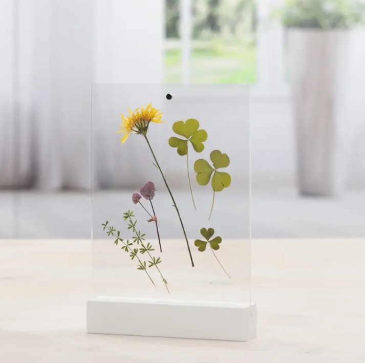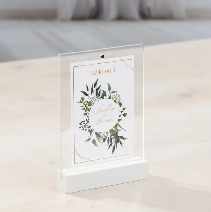 - moderní akrylový stojánek na fotografie s bílou základnou z MDF materiálu