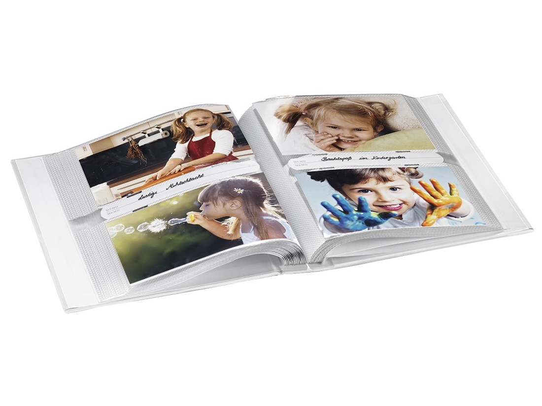 Fotoalbum na 200 fotografií 10x15cm, Lepená vazba, dvě fotografie nad sebou, popiska mezi fotografiemi, štítky na popisky v zadní kapse fotoalba.
