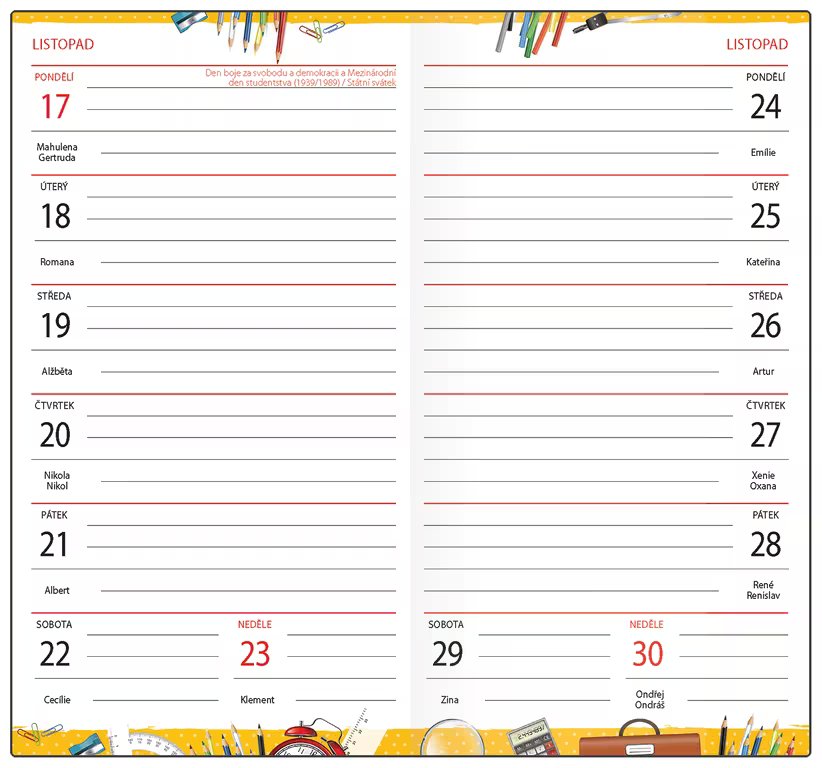 Školní deníček - diář s rozvrhem hodin a možností zapisování úkolů a poznámek na školní rok 2025/2026 s českým kalendáriem.
