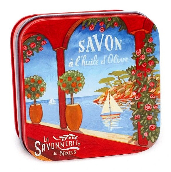 100g levandulové mýdlo s vůní v kovové krabičce zdobené vyobrazením krajiny Azurového pobřeží.