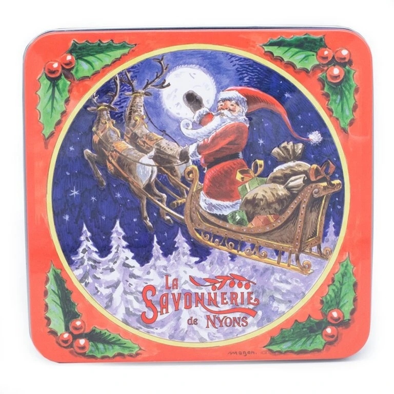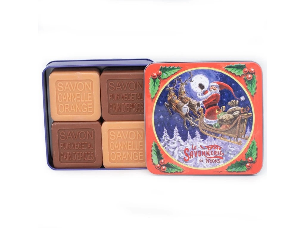 Udělejte radost sobě i svým blízkým s vánoční sadou čtyř 100g mýdel v kovové dóze „Le Traîneau“ od La Savonnerie de Nyons. Hřejivé vůně perníku a skořice s pomerančem navozují atmosféru svátků, zatímco přírodní složení s BIO bambuckým máslem a olivovým olejem z Nyons jemně pečuje o pokožku. Ilustrace Santa Clause na saních od malíře Luc Mazana dává celé dóze nezaměnitelný retro šarm. Po spotřebování mýdel může sloužit jako stylová zimní dekorace.