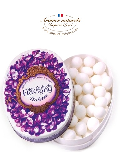 Les Anis de Flavigny. Bonbon z fialky Složení: cukr, přírodní aroma, zelené zrníčko anýzu (0,2%), výtažek z fialky.