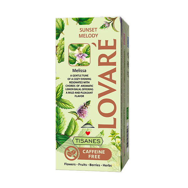 Lovaré Sunset Melody je čistý bylinný čaj složený ze 100% drcených listů meduňky. Jeho jemná a osvěžující chuť přináší dokonalý klid a pohodu.
