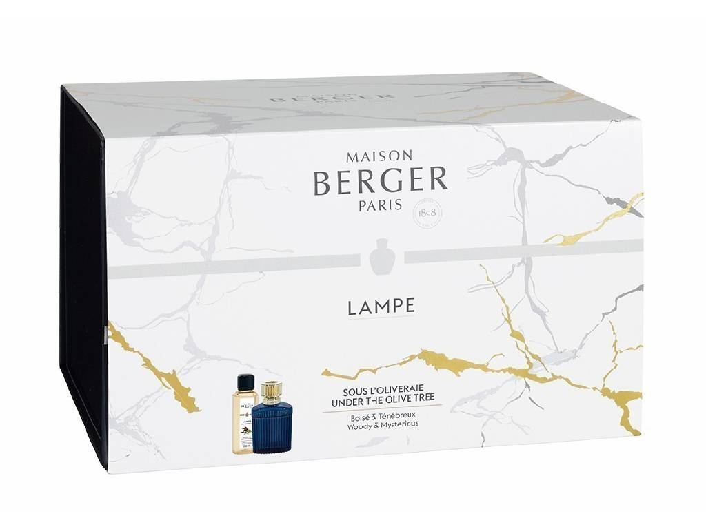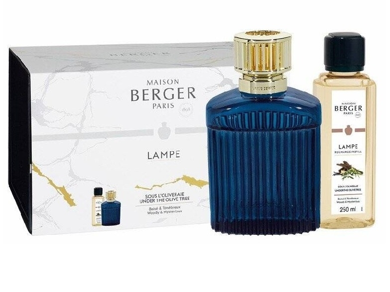 Dárková sada obsahuje katalytickou lampu Alpha značky Maison Berger Paris z lakovaného skla v barvě královská modř a interiérový parfém Pod olivovníky o objemu 250 ml. Jde o smyslně svůdnou a orientální vůni dřeva, v níž ucítíte ve vysokých tónech směsici vůní jasmínu, pryskyřičné myrhy a dřeva, v srdci pak dřevitý akord: oudh, cedru a olivovníku, které v základu podtrhuje pačuli a zjemňuje vanilka s pižmem.