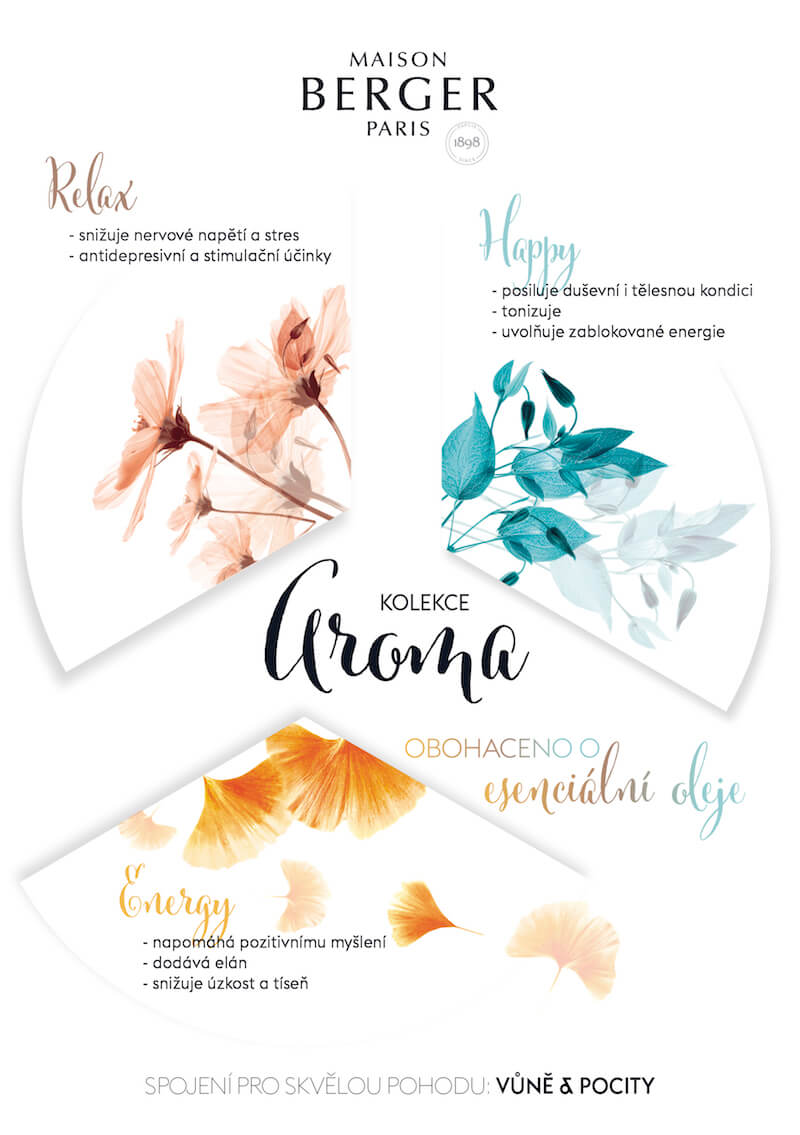 Žijeme ve světě plném každodenního stresu a nervozity, proto je více než žádoucí, aby byl náš domov oázou klidu, pohody a pozitivní energie. A to je důvod, proč Maison Berger přichází s novou kolekcí tří vůní, které jsou obohacené o blahodárné účinky esenciálních olejů. Tyto jemné vůně uvolní vaše tělo i mysl, oživí vaše smysly a povzbudí vaši náladu.